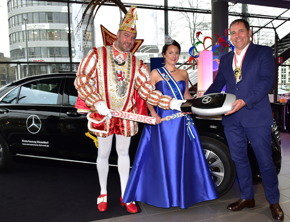 Jetzt kann die Session so richtig beginnen: Im Rahmen einer Feierstunde in der Mercedes-Benz-Niederlassung übernahm das Prinzenpaar der Landeshauptstadt Düsseldorf am heutigen Mittwoch „seine“ traditionellen Luxuslimousinen: Je eine schwarze S-Klasse für Prinz Carsten II. (Kennzeichen D-PC) und Venetia Yvonne (D-VY). Michael Eßer, der Niederlassungsleiter und Verkaufschef PKW für die Niederlassung Rhein-Ruhr, betonte dabei, dass es für ihn eine große Freude sei, das Prinzenpaar und sein Gefolge auch in diesem Jahr mit Fahrzeugen unterstützen zu können. „Wir tun dies seit fast 40 Jahren und selbstverständlich sind wir auch beim Rosenmontagszug mit unserem Motivwagen „Sternenflotte“ mit von der Partie“, sagte Eßer.